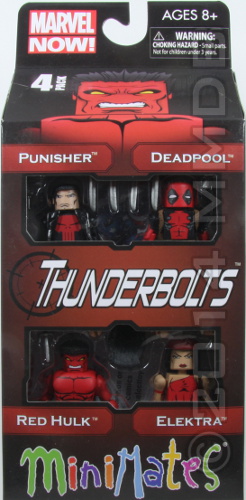 Assembled by General Thunderbolt Ross, a.k.a. the Red Hulk, the newest incarnation of the Thunderbolts may be the deadliest yet. Rather than convicted super-criminals, the new Thunderbolts are all killers-at-large, each with their own troubled history. Elektra, the assassin; The Punisher, the vigilante; Deadpool, the mercenary. Along with Agent Venom, they make for an unlikely team, but there is no army on Earth that can stand in their way once the mission is underway. Each Minimate includes a variety of interchangeable parts and accessories.