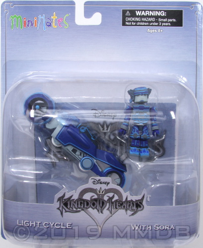 This Light Cycle, based on the Space Paranoids world of Kingdom Hearts, features real rolling wheels and can seat one Minimates mini-figure. The Sora Minimate features 14 points of articulation and fully interchangable parts. Both Sora and the Light Cycle are compatible with other Kingdom Hearts Minimates.